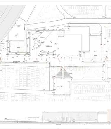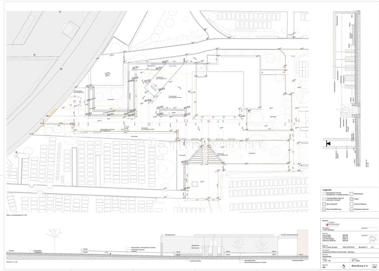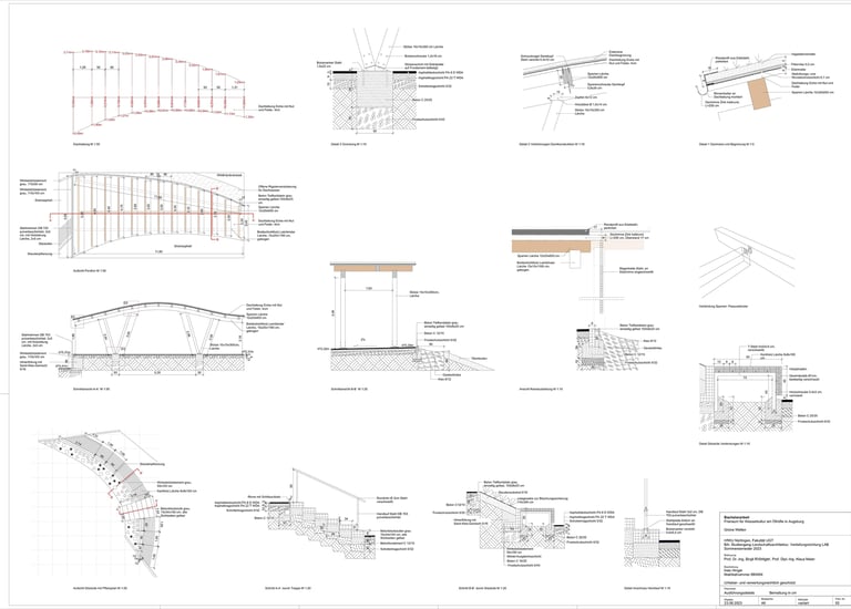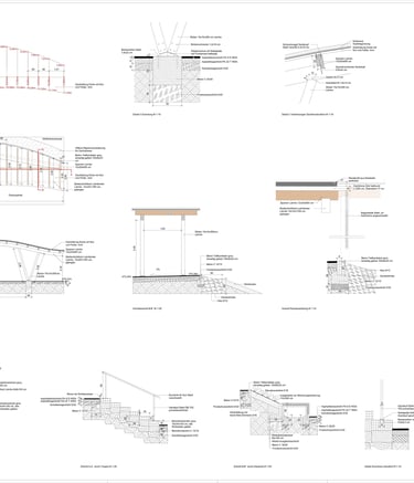 Absteck- und Höhenpläne, Schnitte, Ansichten und Detailzeichnungen in verschiedenen Maßstäben.